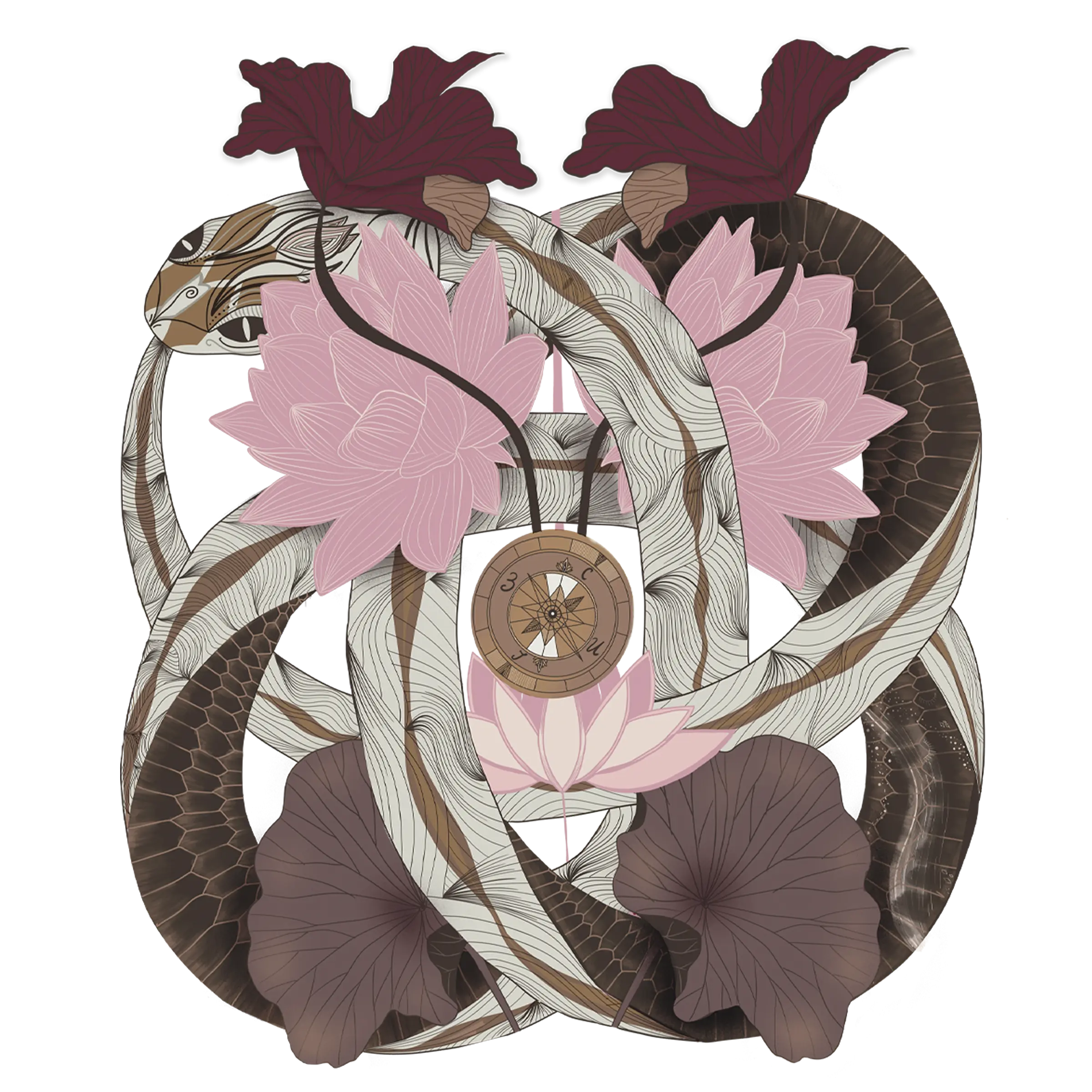 U njenom središtu nalazi se zmija Uroboros, simbol cikličnog rasta i unutrašnje snage, koja grize sopstveni rep, ali ne da bi se povredila, već da bi se obnovila i povratila svoj sjaj. Upravo u toj ravnoteži leže srce, duša i naš sopstveni kompas – pomalo izmešten, jer put ka sebi nikada nije pravolinijski.